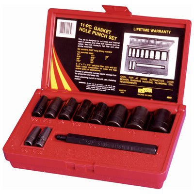 - Contains long driving mandrel. Ten punch sizes: 1/4½, 5/16½, 3/8½, 7/16½, 1/2½, 9/16½, 5/8½, 3/4½, 7/8½, 1½.
