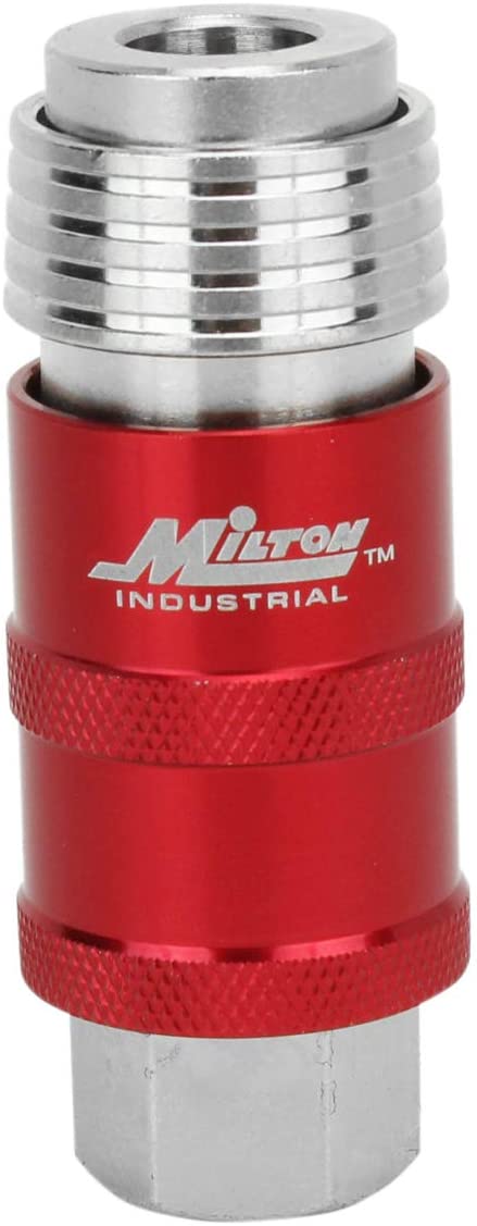 The Milton® 5 In One® Universal Safety Exhaust Coupler (1/4" NPT) is a patented heavy-duty steel coupler designed to safely bleed off air pressure before disconnection, preventing dangerous hose whip. It is compatible with Industrial (M-Style®), High Flow (V-Style), Automotive (T-Style), Aro (A-Style), and Lincoln (L-Style) interchanges.