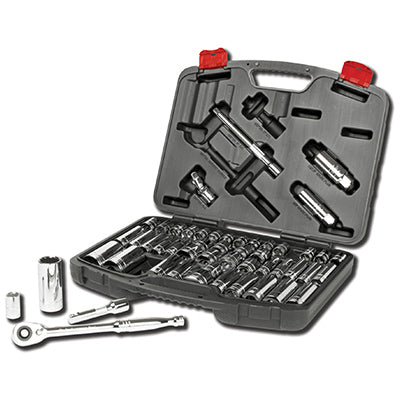 - Set contents: 1pc. 3/8" dr. quick release ratchet, 1pc. universal joint, 2pcs. 3 and 6" extensions, 2pcs spark plug sockets, 25pcs SAE and metric std. sockets and 20pcs. SAE and metric deep sockets.