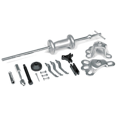 - Contains slide hammer with multiple attachments including 2/3 jaw, internal and external pullers, rear axle puller, locking pliers adaptor, puller hook and dent puller.